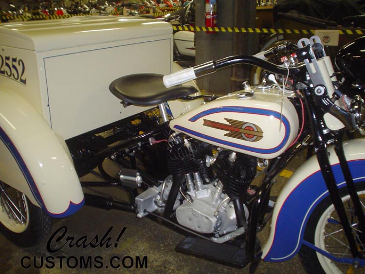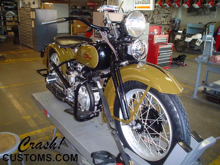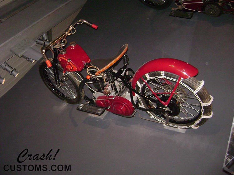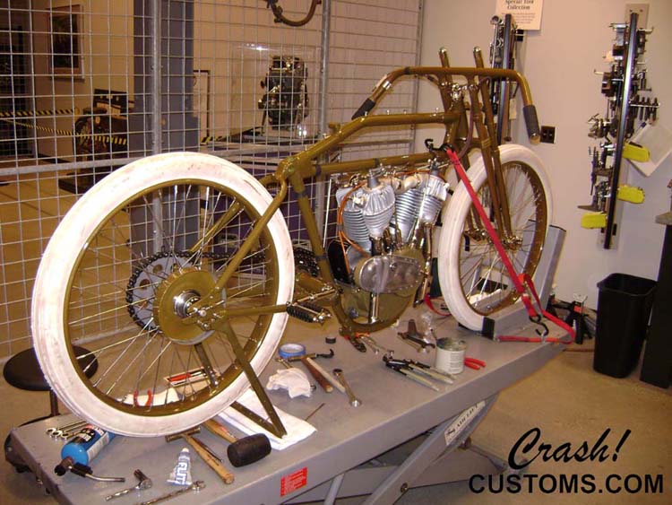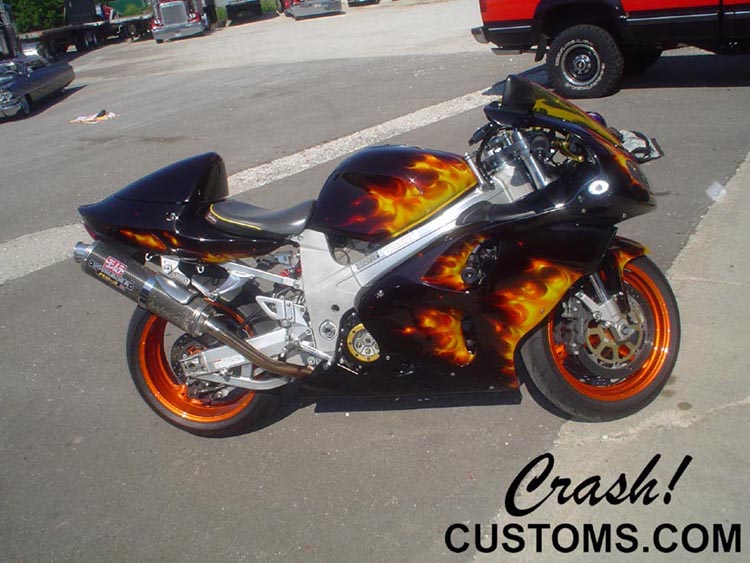 Custom Metric Chopper. Crash's own personal bike. Complete bodywork and custom paint. Smoothed and molded frame. '37 Ford custom tail lights. Painted and detailed engine. House of Color candies over boat flake. Custom cut rear fender, Jesse James gas tank. Custom headlight, custom ammo box and mount.