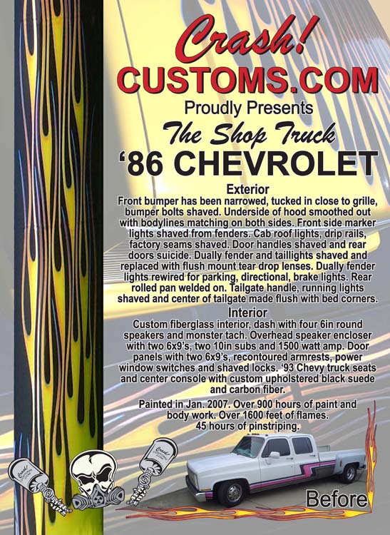 We can create a special display board to show off by your car at the shows. These boards are a high quality PVC board with a glossy finish that is UV coated and won't fade in the sun. Can be custom made to any size. We will lay out the script and choose a background image of your car. If you should choose to handle to creative aspect, we can accommodate that too. You've spent a lot of money on the ride of your dreams...now you just need a professional finishing touch. When you have your vehicle restored or customized by Crash!, we will make a display board for you. Here are a few samples below. Prices start at $200. Please contact us for more information.